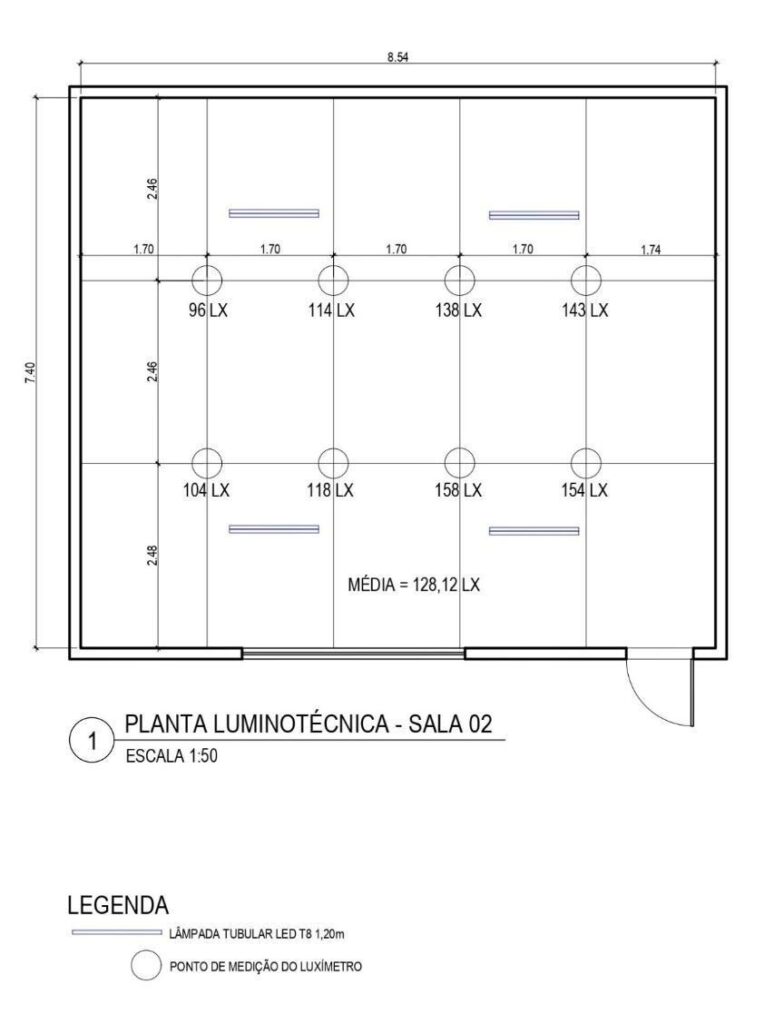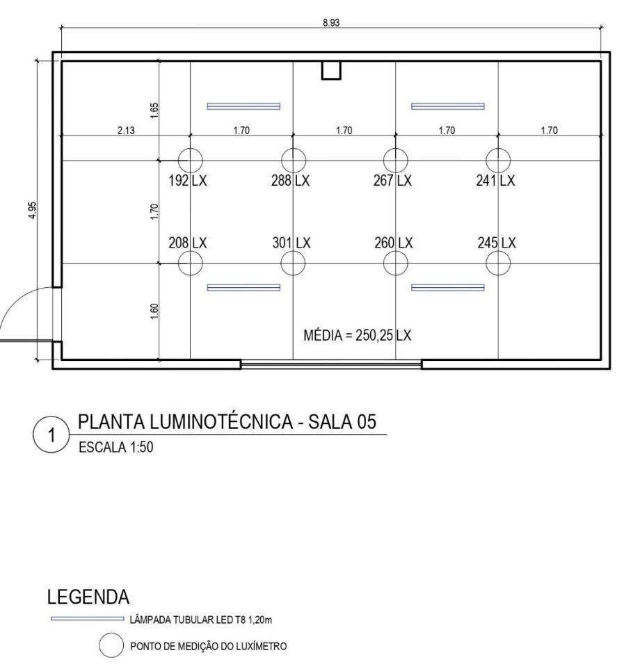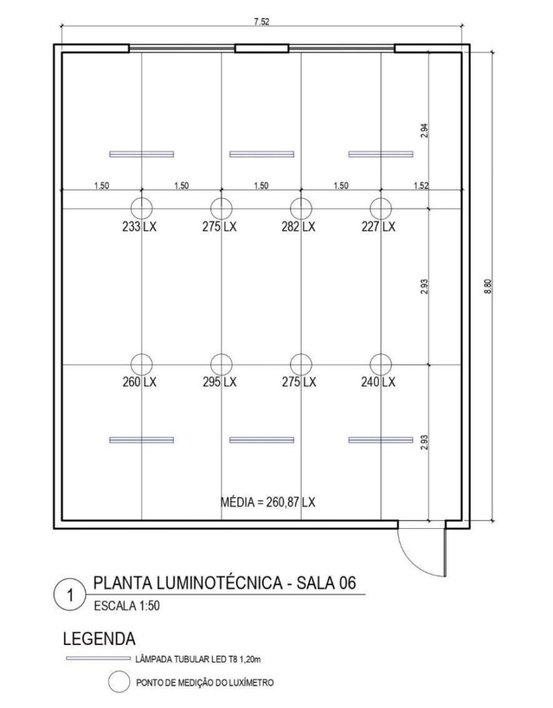 Com base nos parâmetros definidos, obteve-se um índice de local (K) de 1,30, um coeficiente de utilização (u) de 0,65 e um coeficiente de manutenção (d) de 0,70. Aplicando-se a fórmula de cálculo, o fluxo luminoso total necessário para atender ao nível de iluminância da norma foi de 23.736,26 lúmens. Cada luminária, composta por duas lâmpadas de 1.850 lúmens cada, fornece 3.700 lúmens. Dessa forma, o cálculo resultou na necessidade de aproximadamente 7 luminárias, ou seja, a instalação prática exige 7 luminárias para garantir o atendimento da iluminância mínima exigida pela norma e assegurar a uniformidade da iluminação no ambiente conforme a Figura 05.
