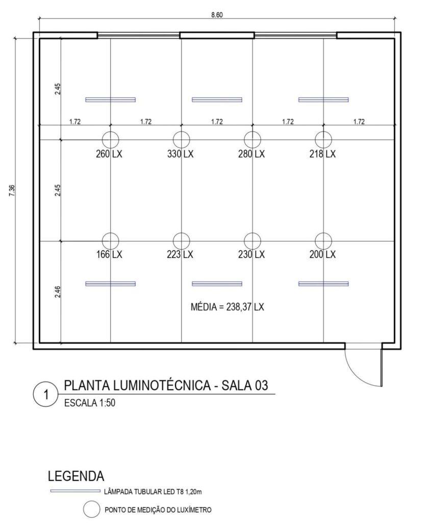 A sala possui área de 63,29 m², pé direito de 3,20 m, altura da área de trabalho 76cm, 12 lâmpadas sendo 2 por luminária, iluminância média de 238,37 lux. Alguns pontos ultrapassam a iluminância exigida pela norma, no entanto a iluminância geral não atende.