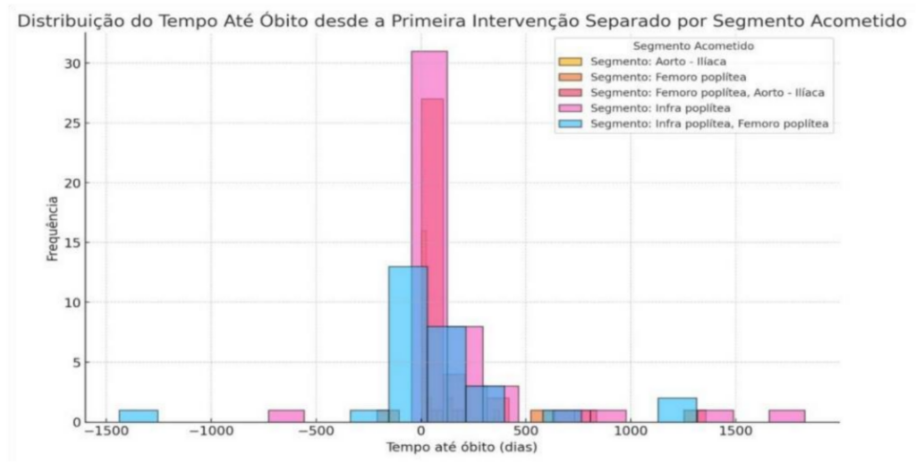 Ainda, óbito tardio: Pacientes que sobreviveram por um período prolongado (acima de 1000 dias) após a primeira intervenção sugerem que o procedimento pode ter sido eficaz em retardar o avanço da doença por um tempo, mas, eventualmente, outros fatores cardiovasculares ou a progressão da DAOP podem ter levado ao óbito.