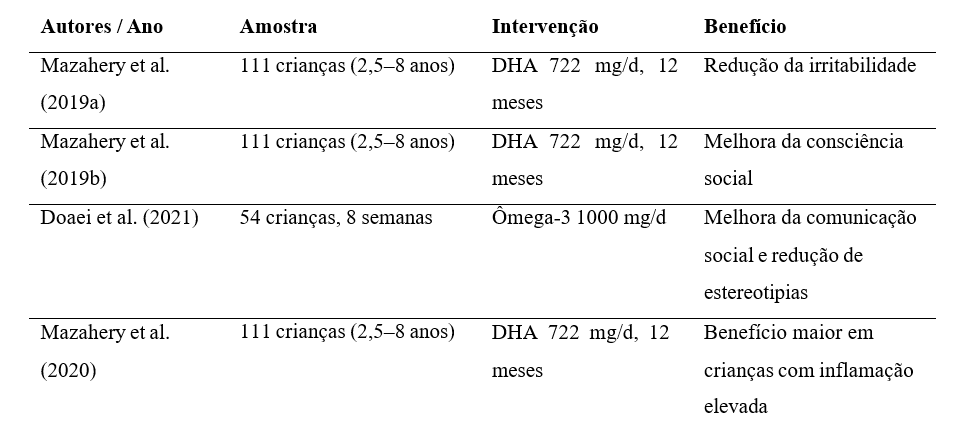 Estudos com 111 crianças submetidas a 722 mg/d de DHA por 12 meses (Mazahery et al., 2019a; 2019b) demonstraram melhorias comportamentais significativas, enquanto um estudo com 54 crianças que receberam 1000 mg/d de ômega-3 por 8 semanas (Doaei et al., 2021) também evidenciou avanços na comunicação social, indicando que doses adequadas, mesmo por períodos mais curtos, podem gerar benefícios.