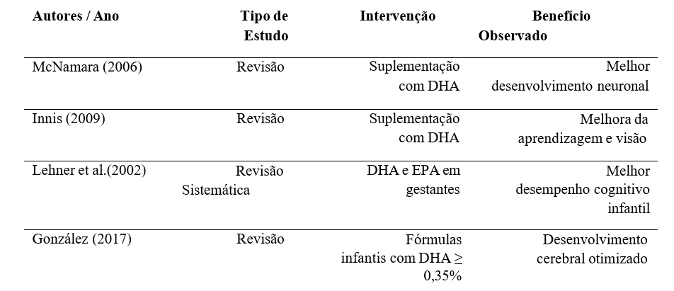 Na tabela 3 apresenta evidências científicas que relacionam a suplementação de ômega-3, especialmente DHA e EPA, ao desenvolvimento cerebral. Estudos revisados mostram benefícios que vão desde a melhora da aprendizagem e visão até o desempenho cognitivo infantil e a otimização do desenvolvimento neuronal.