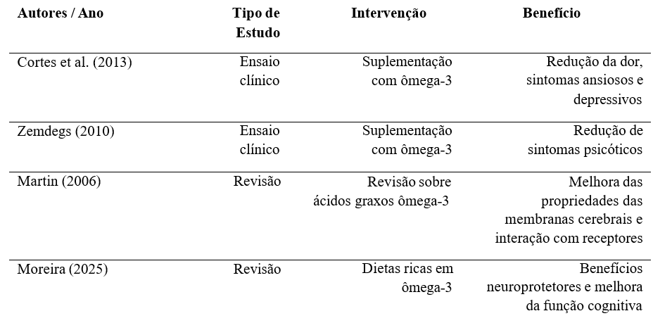 Na tabela 2 apresenta uma síntese dos principais mecanismos de ação do ômega-3 no sistema nervoso, com base em diferentes tipos de estudos. São evidenciados benefícios que vão desde a melhora da função cognitiva até a redução de sintomas ansiosos, depressivos e psicóticos. Os achados reforçam o papel do ômega-3 como modulador neuroquímico e estrutural, com impacto positivo na saúde cerebral. Além disso, destaca-se sua contribuição para a integridade das membranas celulares e efeitos neuroprotetores. Essa visão integrada demonstra o potencial do ômega-3 como aliado em estratégias nutricionais voltadas à saúde mental.