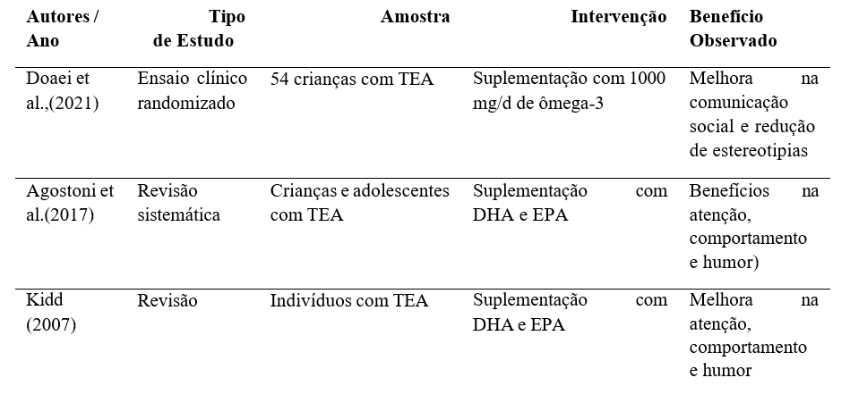 A deficiência de ômega-3 pode exacerbar desequilíbrios neuroquímicos no TEA, como a disfunção mitocondrial e o estresse oxidativo. Pesquisas recentes destacam seu papel na regulação de microRNAs envolvidos na plasticidade sináptica. Apesar das lacunas, intervenções nutricionais direcionadas são vistas como coadjuvantes promissores, especialmente em estágios precoces do desenvolvimento, quando a neuroplasticidade é máxima (WEISER et al., 2016). Esses aspectos são melhor detalhados e sintetizados na Tabela 1.