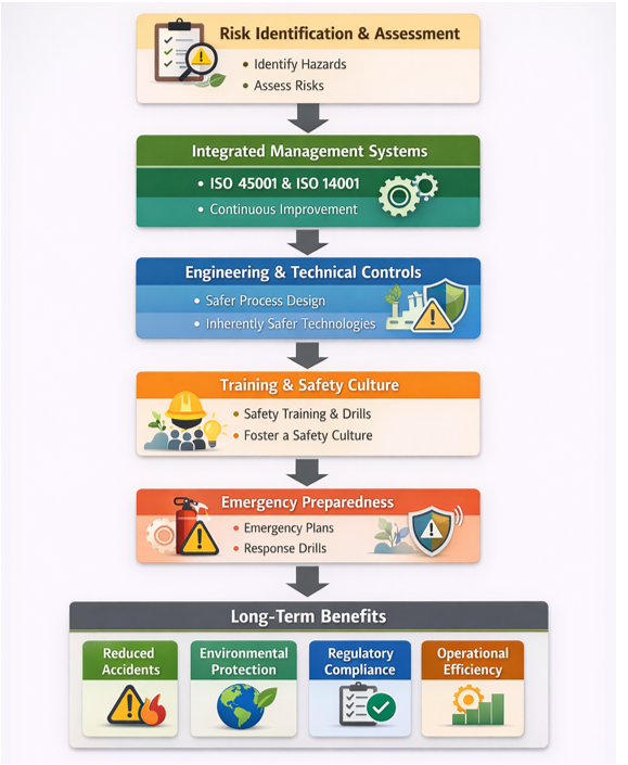 The flowchart presents a structured approach to preventing workplace accidents and environmental disasters by emphasizing proactive and integrated risk management. It begins with risk identification and assessment, where potential occupational and environmental hazards are systematically identified and evaluated. This stage feeds into integrated management systems, aligned with international standards such as ISO 45001 and ISO 14001, which support continuous improvement and coordinated safety and environmental controls. The process then advances to engineering and technical controls, focusing on safer process design and the adoption of inherently safer technologies to minimize the likelihood of failures. Training and the development of a strong safety culture play a central role by ensuring that employees are competent, aware of risks, and actively engaged in prevention efforts. Finally, emergency preparedness ensures that organizations are ready to respond effectively to incidents, reducing their potential consequences. Together, these steps lead to long-term benefits, including fewer accidents, enhanced environmental protection, improved regulatory compliance, and greater operational efficiency.