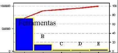 A conta de ferramentas parece ser responsável por 73,4% dos gastos variáveis de produção. Outras contas são: Gases, Óleos e Inflamáveis (B), Materiais de Manutenção (C), Materiais de Escritório (D), Tintas, Solventes e Materiais de Limpeza (E).