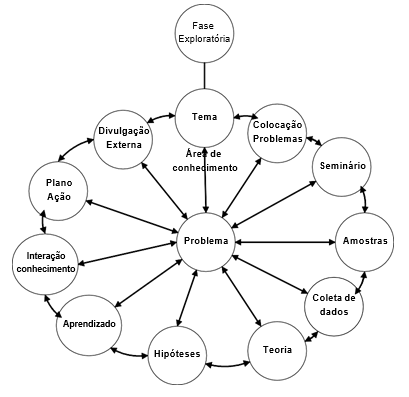 O ciclo é dividido em planejamento, ação, reflexão ou avaliação, e mais adiante ação e as fases utilizadas no trabalho foram a fase exploratória com a definição do projeto; estudo dos problemas; coleta de dados e aprendizagem; plano de ação e divulgação, conforme Figura 3.