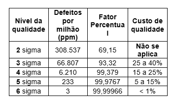 Na Tabela 2, temos um demonstrativo dos benefícios alcançados pelas organizações adeptas ao Seis Sigma de qualidade comparando com nível 4 Sigma.