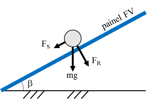 Inicialmente, considera-se uma partícula em repouso sobre o painel com um ângulo de inclinação . A força da gravidade (mg) é decomposta em dois componentes fundamentais: a força de deslizamento Fs, paralela à superfície, que atua no sentido de remover a partícula por gravidade; e a força ortogonal, que atua no sentido de aderir a partícula ao painel. Somam-se a este componente ortogonal as forças de Van der Waals Fv e eletrostáticas Fe, resultando na força de retenção FR, conforme ilustrado na Figura 1.
