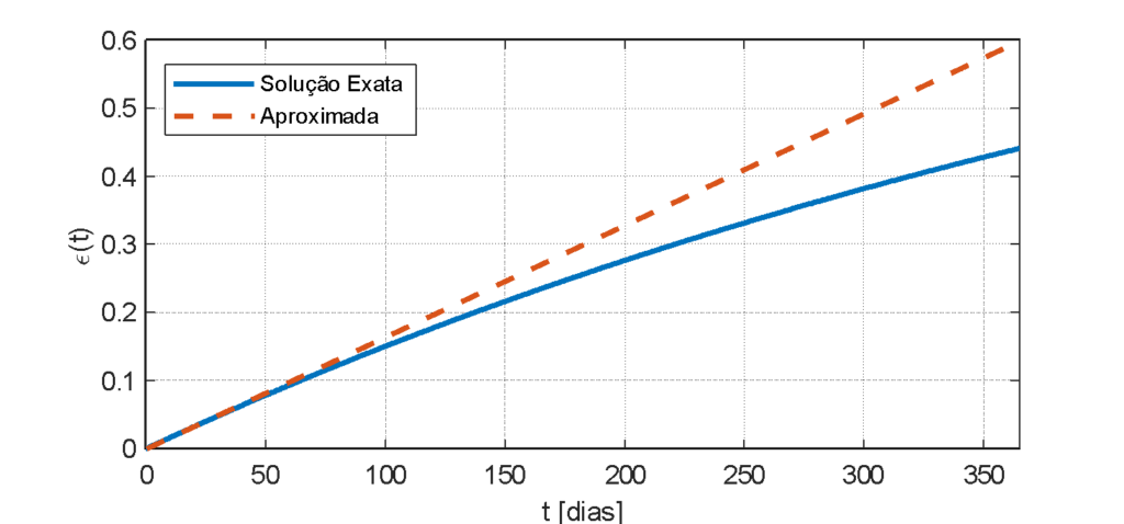O período mais curto, obtido pela aproximação, é justificado pelo modelo simplificado assumir um crescimento da fração de cobertura de poeira com uma velocidade constante ao longo do intervalo de tempo, enquanto a solução exata mostra uma desaceleração a medida que a superfície vai sendo saturada, até alcançar o equilíbrio em ε=0, conforme ilustrado anteriormente na Figura 2. Isto faz com que a solução aproximada proposta seja mais conservadora, indicando uma frequência maior do que a frequência ótima. Todavia, o resultado ilustrativo mostrou que, mesmo para um cenário onde o período é superior a quatro meses, afastando-se do pressuposto de uma baixa cobertura de sujidade no sistema, a estratégia proposta encontrou uma solução com um erro de apenas 7,72% do ótimo obtido numericamente.