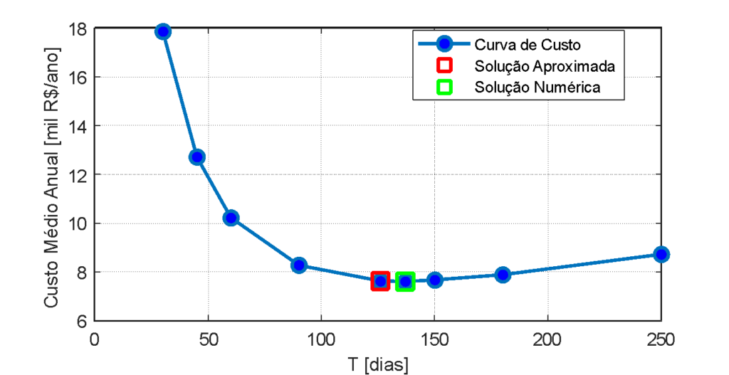 Para avaliar o grau de conservadorismo associado à aproximação adotada na solução analítica proposta, realizou-se um método numérico para encontrar, por busca, o mínimo global, que indica uma limpeza periódica a cada 137 dias, um período mais longo que os 126 calculados com o uso da aproximação. Na Figura 4, apresenta-se o custo médio anual médio, considerando o custo de limpeza mais a energia comprada para suprir a geração perdida, considerando um cenário simulado de 10 anos, comparando, além das duas políticas mencionadas, o custo de limpeza com periodicidade de 30, 45, 60, 90, 150, 180 e 250 dias. Neste cenário, a limpeza com periodicidade de 126 dias, calculada utilizando a aproximação, resulta em um custo médio anual de 7626,67 u.m., enquanto a condução da limpeza a cada 137 dias resulta num custo médio anual de 7616,70 u.m., uma diferença de 9,97 u.m., que percentualmente representa uma custo de apenas 0,13% subótimo.