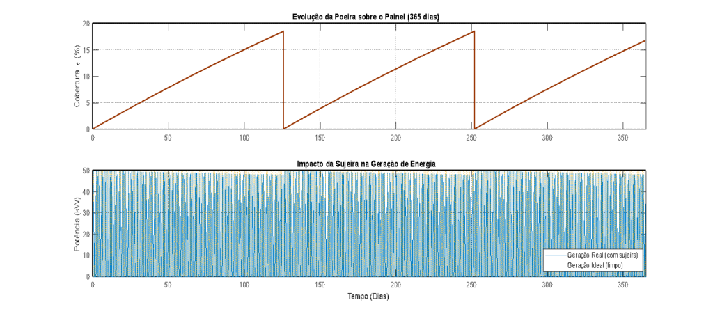 Figura 3: Topo: curva da evolução da cobertura de poeira no sistema ao longo do ano. Baixo: geração diária de energia do sistema comparada com o valor a ser gerado pelo sistema limpo.