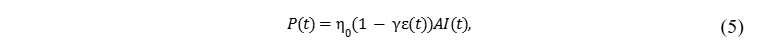 onde P é a potência, 0 é a eficiência elétrica do módulo, é um coeficiente de degradação ligado ao índice de transmissão da camada de poeira, A é a área do sistema fotovoltaico e I a irradiância. A perda de potência em relação a um painel perfeitamente limpo pode ser dada por: