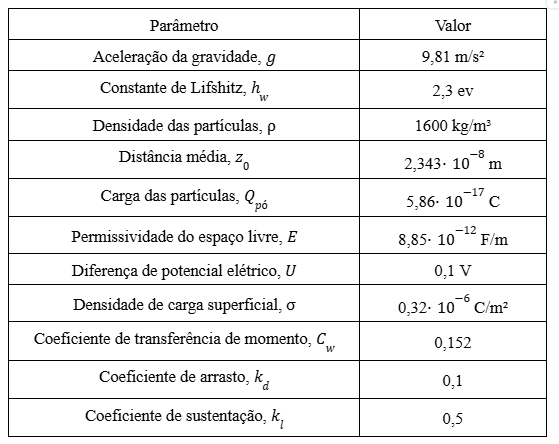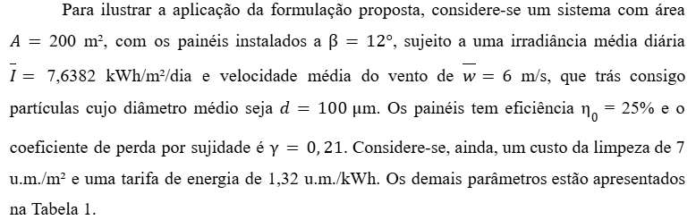 Nesta formulação, as forças de Van der Waals são modeladas em função da constante de Lifshitz hw e da distância média entre a partícula e a superfície z0. O balanço entre FS e FR determina a taxa de variação temporal da fração de cobertura de poeira , permitindo a estimativa da degradação de performance do sistema ao longo do tempo, a qual será utilizada na próxima seção.