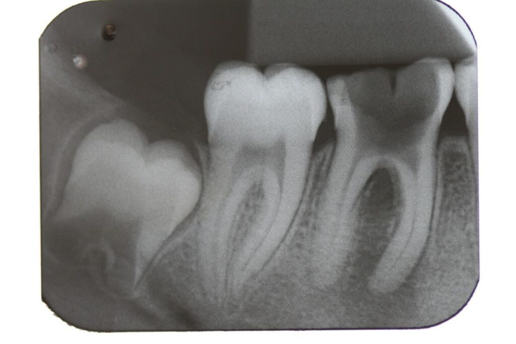Paciente, sexo feminino, 15 anos de idade compareceu a clinica Consult Odontologia, em Tucuruí-PA, com histórico de perca precoce do primeiro molar inferior direito (dente 46). Ao exame clínico, observou-se presença de destruição coronária e desarmonia oclusal. Através de uma radiografia periapical, confirmou-se o diagnóstico de necrose pulpar com comprometimento da estrutura dentária, com rarefação óssea indicando lesão periapical no dente em questão (figura 1).