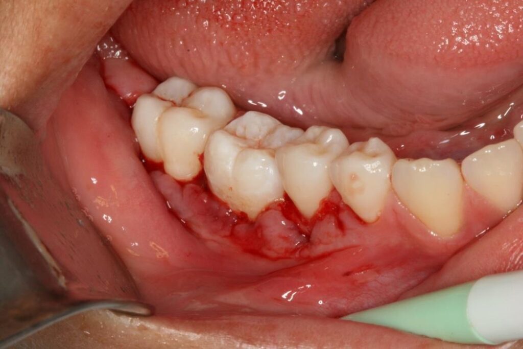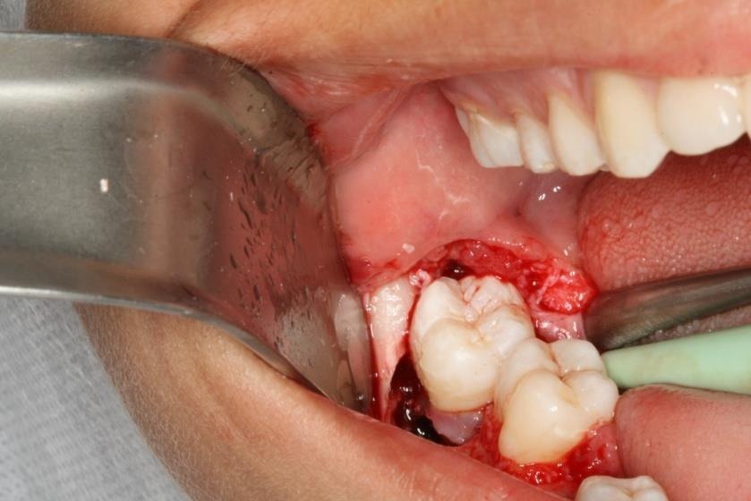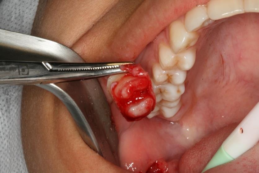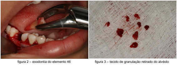 Técnica cirúrgica realizada em dois passos. Primeiramente, exodontia do elemento 46 (1° molar), curetagem do alvéolo para eliminar focos de infecção e preparação do alvéolo para o futuro transplante. (figura 2 e 3).