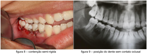 Após sutura do tecido foi feito contenção semi-rígida com fio ortodôntico n° 0 para fixação do elemento dentário no alvéolo, posicionado elemento transplantado abaixo da linha de oclusão para evitar traumas oclusais (figura 8 e 9).