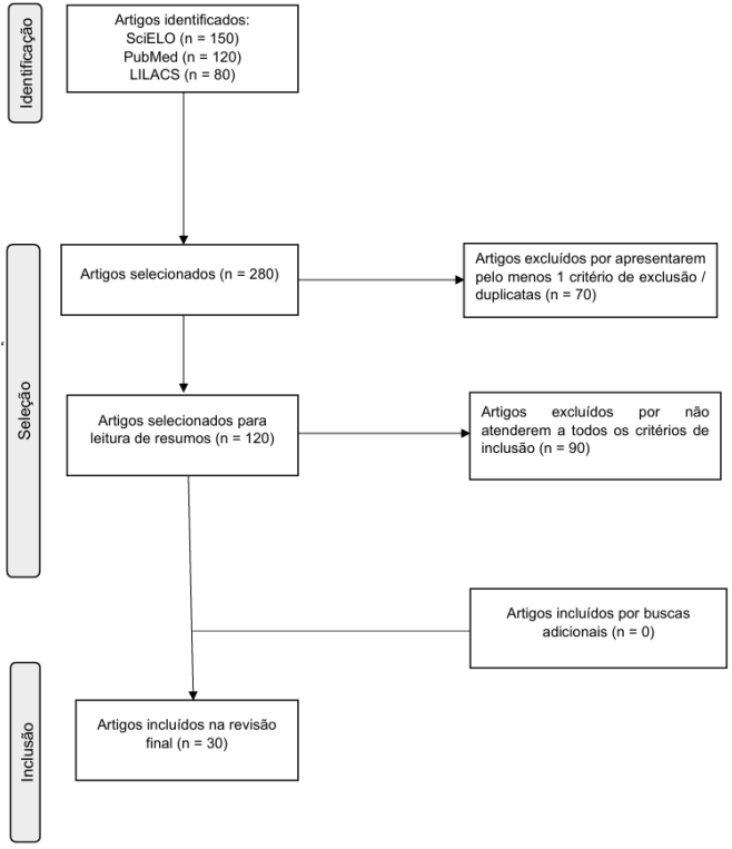 Na etapa de avaliação dos resumos, 120 artigos foram selecionados para leitura integral. Destes, 90 foram excluídos por não contemplarem todos os critérios de inclusão previamente estabelecidos. Ao final do processo, 30 estudos compuseram a amostra final da revisão, conforme apresentado no fluxograma da Figura 1, que detalha as fases de identificação, triagem, elegibilidade e inclusão.