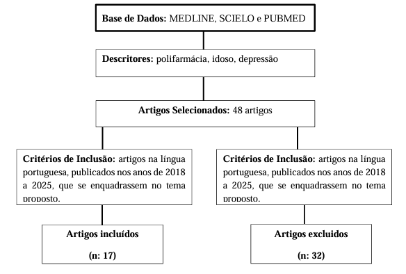O levantamento bibliográfico foi conduzido através de uma busca de artigos científicos publicados entre os anos 2018 a 2025. Foram selecionados nas bibliotecas virtuais um quantitativo de 48 artigos relacionados ao tema proposto. As fontes de dados incluíram SciELO e PubMed. Com os descritores: idoso, antidepressivos e polifarmácia.