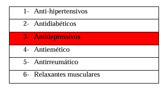 A respeito da classe de antidepressivos, os resultados mostram que os antidepressivos tricíclicos, apresentam um perfil de segurança desfavorável para a população idosa, embora eficazes no tratamento da depressão, os seus efeitos anticolinérgicos, cardiovasculares e sedativos, provocam efeitos adversos no paciente, como boca seca, constipação, taquicardia e hipotensão ortostática, sendo a ultima um fator de risco significativo para queda e fraturas (Ferreira; Melo, 2018)