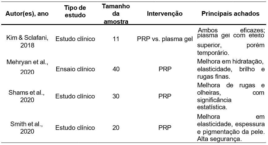 Os estudos incluíram amostras que variaram de 11 participantes (Kim & Sclafani, 2018) a 40 participantes (Mehryan et al., 2020). De forma geral, os estudos identificaram que tanto o PRP quanto o PRF demonstraram eficácia significativa no rejuvenescimento facial, com efeitos positivos como: redução de rugas e sulcos finos, melhora da textura e elasticidade da pele, aumento da hidratação e espessura dérmica, redução de manchas e poros, além de alta satisfação e segurança relatada pelos pacientes.