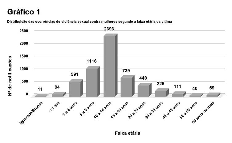 O gráfico 1 revela as faixas etárias mais afetadas pela violência sexual contra mulheres, sendo expressivo o número de casos entre a faixa de 5 a 14 anos, somando um total de 3.509 (60,21%).