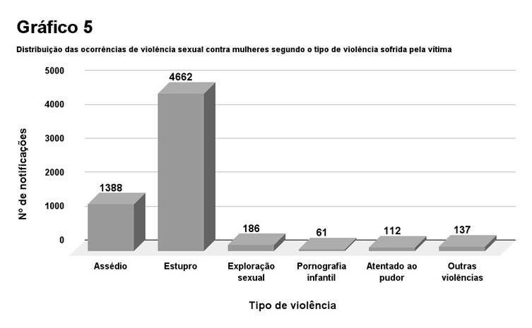O gráfico 5 traz dados a respeito do tipo de violência sofrido pelas vítimas. O estupro foi a agressão mais notificada, com o total de 4.662 (71,22%) casos, seguido pelo assédio, com 1.388 (21,20%) notificações.