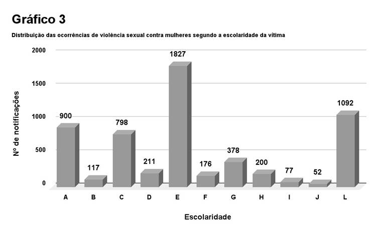 Legenda do gráfico 3: A – Ignorado/Branco; B – Analfabeto; C – 1ª a 4ª série incompleta do ensino fundamental; D – 4ª série completa do ensino fundamental; E – 5ª a 8ª série incompleta do ensino fundamental; F – Ensino fundamental completo; G – Ensino médio incompleto; H – Ensino médio completo; I – Educação superior incompleta; J – Educação superior completa; L – Não se aplica.