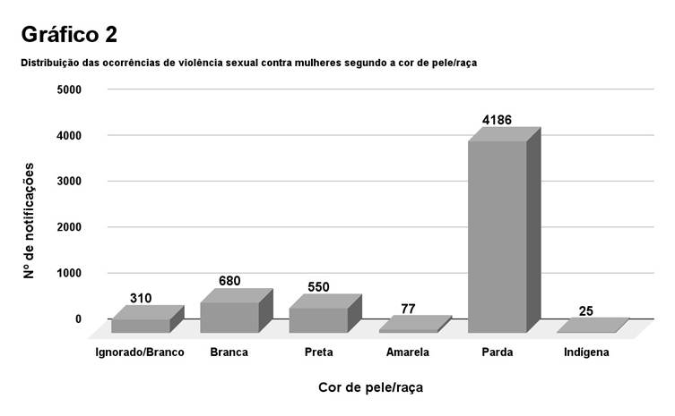 No Piauí, a cor da pele/raça mais autodeclarada entre as vítimas da violência sexual é a parda, correspondendo a 71,83% das notificações. Esse resultado se assemelha ao encontrado em outros estudos que avaliam a violência sexual contra mulheres. Outro estudo, que descreve o perfil epidemiológico das vítimas da violência no Distrito Federal também corrobora com o maior número de notificações entre mulheres pardas (SILVA LEL e OLIVEIRA MLCO, 2016). Paralelarmente, no Brasil, observou-se um aumento, quando se descreve os anos de 2009 e 2013 entre as notificações de mulheres pardas que foram vítimas da violência sexual (GASPAR RS e PEREIRA MUL, 2018).