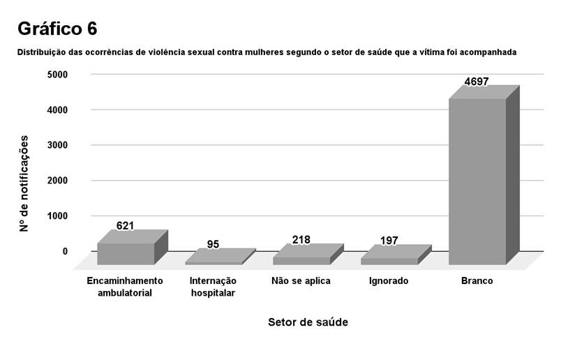 No gráfico 6, é observado como ocorre o seguimento da vítima na área da saúde. Entre as notificações, 621 (10,66%) foram encaminhadas para nível ambulatorial e 95 (1,63%) tiveram que ser internadas em hospitais. O dado alarmante diz respeito ao grande número de casos, 4.697 (80,59%), que não foi registrado o tipo de seguimento realizado.