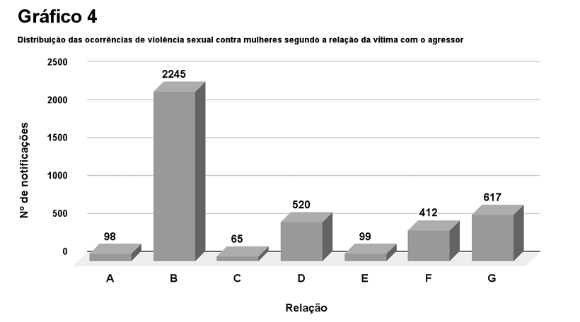 Já o gráfico 4 evidencia a distribuição das ocorrências segundo a relação da vítima com o agressor. Destas, 2.245 (55,35%) foram vítimas de amigos ou conhecidos, 617 (15,21%) do padrasto e 520 (12,82%) casos nos quais o namorado foi o autor da violência sexual.