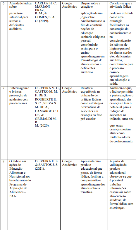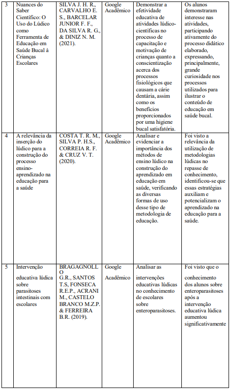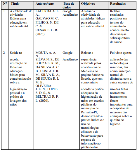 VIEIRA, V. R. et al. Abordagem lúdica na educação em saúde voltada para escolares. Revista Remecs -Revista Multidisciplinar de Estudos Cientí-ficos em Saúde, [S. l.], p. 42, 2021.
