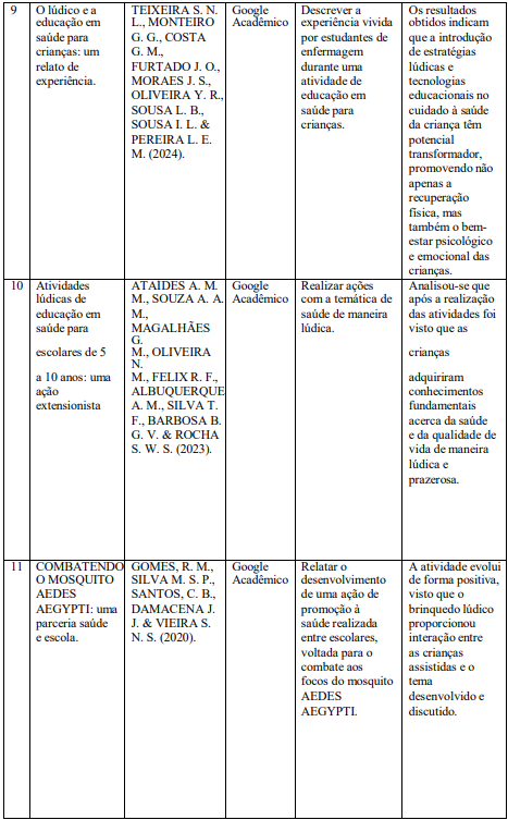 Dentre os resultados analisados por Ataídes et al. (2023), quanto as qualidades obtidas dentro da educação em saúde infantil em diversas faixas etárias sobre diferentes temáticas desde boas práticas até a conscientização da vacinação, foi que através das atividades lúdicas empregadas, as crianças desenvolveram aspectos importantes como a memorização das condutas, a criatividade, e a atração pelos conceitos ensinados, sendo notável que a brincadeira é capaz de transformar o ensino em saúde, além de possibilitar o desenvolvimento da criança em suas habilidades e capacidades.