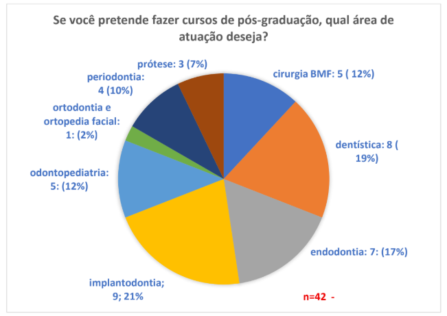 Outro ponto a ser destacado é que 70% dos entrevistados manifestaram intenção de cursar pós-graduação, sendo implantodontia (21%), endodontia (17%) e dentística (19%) as áreas mais procuradas (Gráfico 1). Essa busca por qualificação evidencia a percepção de que o aperfeiçoamento contínuo é indispensável para se manter competitivo no mercado.