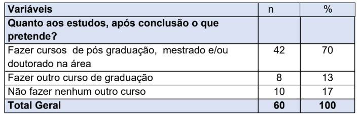 Para Querino et al. (2018), a maioria dos estudantes pretende, após o término do curso, buscar cursos de pós-graduação (69,4%).
