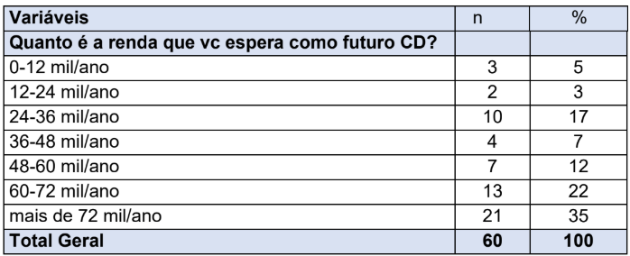 Com relação à remuneração, 35% dos estudantes afirmaram esperar uma média salarial anual superior a R$ 72.000,00 (cerca de R$ 6.000,00 mensais). No entanto, estudos anteriores apresentaram grande variação quanto às expectativas salariais. Machado et al. 2010, relataram pretensão de 6 a 10 salários mínimos na Universidade Federal da Paraíba. Granja et al. (2016), após 5 anos de formado o desejo dos entrevistados é receber remuneração acima de R$5.000,00 (51,0%). De Sousa et al. (2017), também destacou que os estudantes de sua pesquisa projetavam rendimentos entre dois e dez salários-mínimos, revelando que a expectativa salarial é fortemente influenciada pelo contexto regional e institucional. Silva et al. (2018), mostraram que entre os participantes, 47,37% esperam uma renda entre 4-6 mil reais ao mês, enquanto 34,21% demonstraram expectativa de mais de 6 mil reais mensais. Apenas 1 (1,31%) tem expectativa de receber entre mil e 2 mil reais ao mês, 6,58% relataram expectativa entre 2 e 3 mil reais e 10,53% entre 3 e 4 mil reais mensais. Querino et al. (2018), a expectativa de retorno financeiro para a maior parte dos estudantes (41,67%) foi de 6 a 10 salários-mínimos (de R$5.280,00 a R$ 8.800,00).