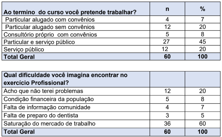 A interpretação destes resultados é de fundamental importância para reconhecimento das características, perspectivas e anseios do aluno formando. Há predominância de mulheres, a principal dificuldade esperada pelos alunos é a saturação do mercado de trabalho, mas almejam trabalhar seja em consultório particular e serviço público, uma parcela significativa dos estudantes planeja realizar uma pós-graduação ou especialização após a conclusão do curso.