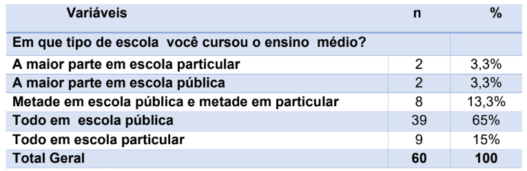 Resultados divergentes deste estudo foram relatados por Silva et al. (2018), quanto à formação, 64,47% dos entrevistados afirmaram ter cursado todo o ensino médio em escola privada, enquanto para Santos & Santos (2025), 48,8% dos alunos ingressantes realizaram o ensino médio todo em escola pública.