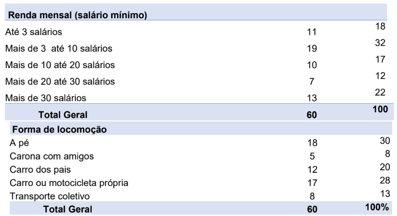 De acordo com (Santos & Santos, 2025), relataram na renda familiar que metade da amostra recebia até 3 salários mínimos (cerca de 10% das famílias recebiam apenas 1 salário mínimo e 41% de 1 a 3 salários), já em relação ao trajeto até a faculdade, 17 participantes afirmaram utilizar seu próprio veículo, 19 informaram que se deslocam com o carro dos pais, 37 usam aplicativos de transporte, 30 optam pelo transporte público, 2 mencionaram motocicleta, 2 recebem carona e 22 fazem o percurso a pé até a universidade.