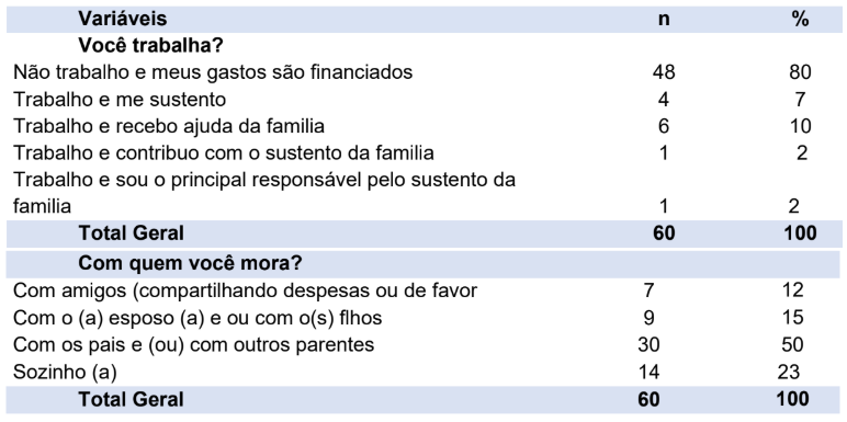 Outro estudo realizado por Silva et al., (2018) mostrou que 39,47% dos alunos declararam estar na faixa de 5 a 10 salários-mínimos e 17,11% superior a 15 salários mínimos. A maioria dos estudantes, cerca de 84,21%, disse que não trabalha e que todos os seus gastos são pagos pela família. Outros 14,47% afirmaram que trabalham e também recebem ajuda financeira da família. Apenas um estudante, o a 1,32%, contou que não recebe nenhum tipo de suporte financeiro da família. Quando o assunto é moradia, 35,53% dos estudantes moram com os pais. Já 27,63% vivem com amigos, 25% moram sozinhos e somente 11,84% dividem a casa com o cônjuge e/ou filhos. Em relação à moradia, 35,53% dos estudantes afirmaram viver com os pais, enquanto 27,63% disseram morar com amigos, 25,00% residiam sozinhos e apenas 11,84% moravam com cônjuge e/ou filhos.