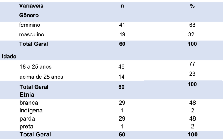 Esses achados acima, estão em consonância com pesquisas anteriores como por exemplo de Silva et al. (2018), que apontaram predominância do gênero feminino, com 53 alunas (69,74%), em relação aos 23 (30,26%) estudantes do gênero masculino. A idade de vinte quatro anos foi a mais observada (28,95%), com apenas dois alunos (2,63%) com mais de trinta anos. A população foi majoritariamente composta por indivíduos autodeclarados brancos (92,10%).