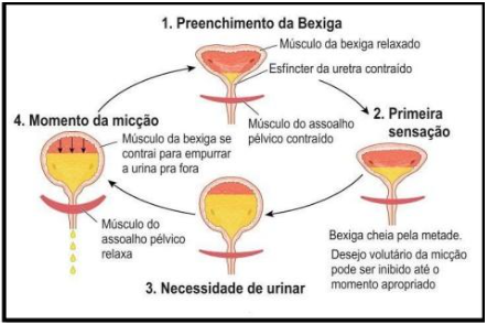 A Bexiga tem um formato semelhante a um balão e pode armazenar entre 650 a 750 ml de urina, possuindo uma parede muscular elástica que se estica conforme se enche. Internamente, é revestida por um epitélio de transição que permite essa expansão, em que armazena urina até que seu volume atinja o nível médio, quando estímulos são enviados pelo córtex cerebral, levando ao seu esvaziamento através da liberação da urina pelo canal uretral. No decorrer dessas reações o músculo detrusor deve estar relaxado, com as fibras musculares da uretra e de todo o assoalho pélvico envolvido na realização da continência (Ramos, 2014).