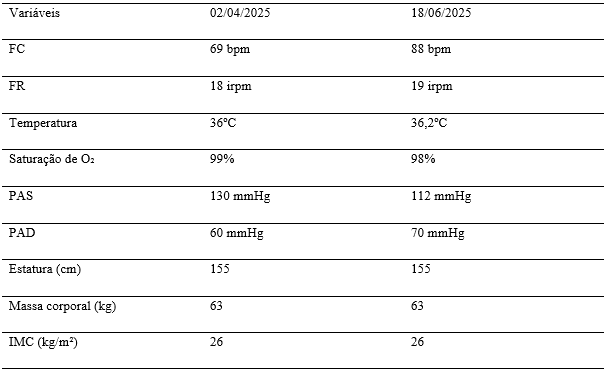 Durante todo o processo terapêutico, não foram registradas intercorrências clínicas, mantendo-se os dados antropométricos e os sinais vitais dentro dos parâmetros fisiológicos.