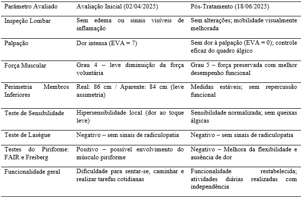 A Tabela 2 abaixo apresenta os achados da avaliação clínica inicial realizada em 02 de abril de 2025 e os resultados observados após 15 atendimentos fisioterapêuticos, concluídos em 18 de junho de 2025.