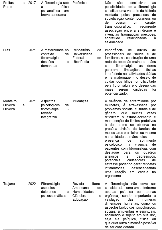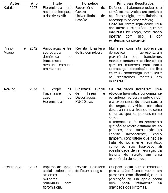 Os autores estudados são unânimes em afirmar a escassez de trabalhos que abordem a fibromialgia relacionada aos aspectos psicológicos, sendo bem mais comuns serem encontrados estudos relacionados aos aspectos médicos. Os achados dos autores também não são consensuais em afirmar uma relação direta da piora dos sintomas da fibromialgia quando em exercício da maternagem, contudo, Pinho e Araujo (2012) defendem a associação de transtornos mentais comuns em mulheres com sobrecarga doméstica, o que a nosso ver poderia estar relacionado às dores e sintomas depressivos em alguns casos de pacientes com fibromialgia.