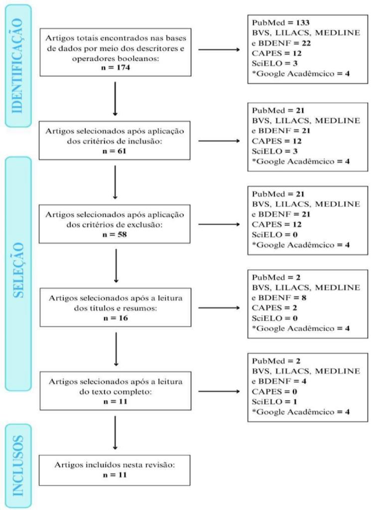 A partir das buscas nas diferentes bases de dados, identificaram-se 174 estudos, destes, 133 artigos eram pertencentes a base de dados PubMed, 22 artigos alusivos à BVS, LILACS, MEDLINE, BDENF, 12 via Portal de Periódicos da CAPES e 3 via SciELO. Além disso, foram utilizados 4 artigos não pertencentes às bases de dados citados acima, selecionados por meio da plataforma Google Acadêmico a partir da leitura do título e resumo.