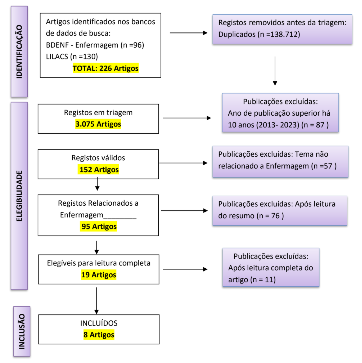 A pesquisa realizada nas bases de dados resultou na identificação de 95 artigos e após aplicação dos critérios de seleção, leitura e análise, foram descartados 76 artigos. A quantidade de artigos com possibilidade de integração para leitura completa foi de 19 artigos e após uma análise detalhada, foram excluídos 11 artigos depois de uma literatura completa. Por fim, totalizando 8 estudos selecionados para esta revisão integrativa. Oito estudos foram publicados no idioma português e quatro em inglês.