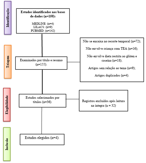 A partir dos critérios de elegibilidade, foram excluídos 32 artigos, dos quais 18 não abordaram as intolerâncias alimentares nos estudos, 11 não envolveram crianças com TEA e 3 que associaram o autismo à outras patologias ou desordens clínicas. Após a leitura detalhada dos artigos, foram selecionados 4 estudos (Figura 1).