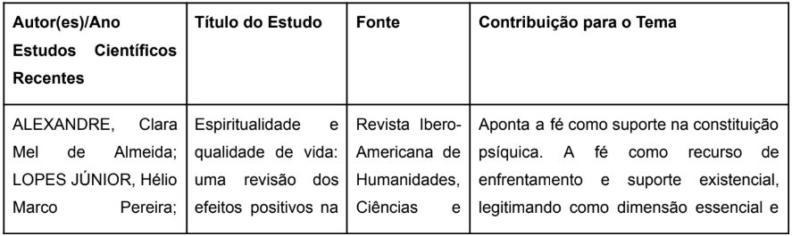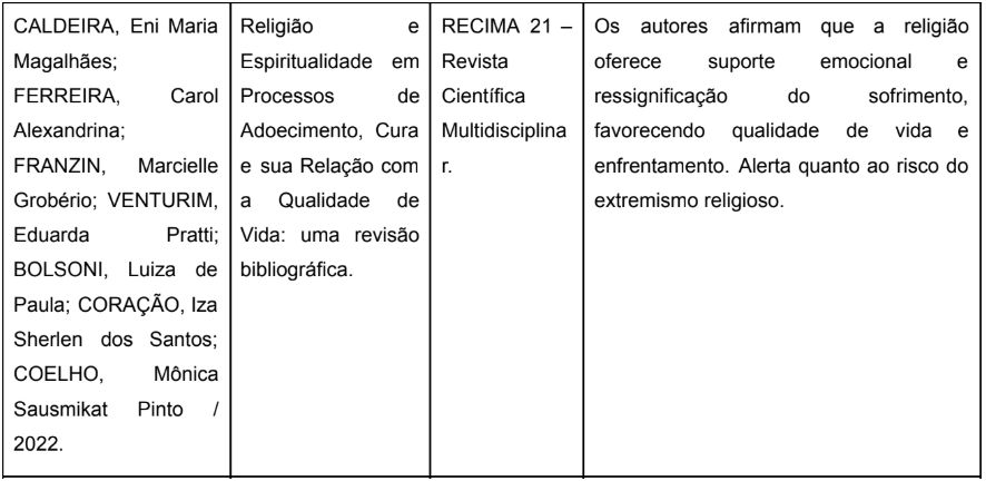 CALDEIRA, Eni Maria Magalhães; FERREIRA, Carol Alexandrina; FRANZIN, Marcielle Grobério; VENTURIM, Eduarda Pratti; BOLSONI, Luiza de Paula; CORAÇÃO, Iza Sherlen dos Santos; COELHO, Mônica Sausmikat Pinto. Religião e espiritualidade em processos de adoecimento, cura e sua relação com a qualidade de vida: uma revisão bibliográfica. RECIMA21 – Revista Científica Multidisciplinar, v. 3, n. 12, p. 11, 2022. Disponível em: https://scholar.google.com/scholar?hl=pt-BR&as_sdt=0%2C5&q=Religi%C3%A3o+e+espir itualidade+em+processos+de+adoecimento%2C+cura+e+sua+rela%C3%A7%C3%A3o+c om+a+qualidade+de+vida%3A+uma+revis%C3%A3o+bibliogr%C3%A1fica.&btnG=&lr=lang_pt. Acesso em 05 de abr. 2025.