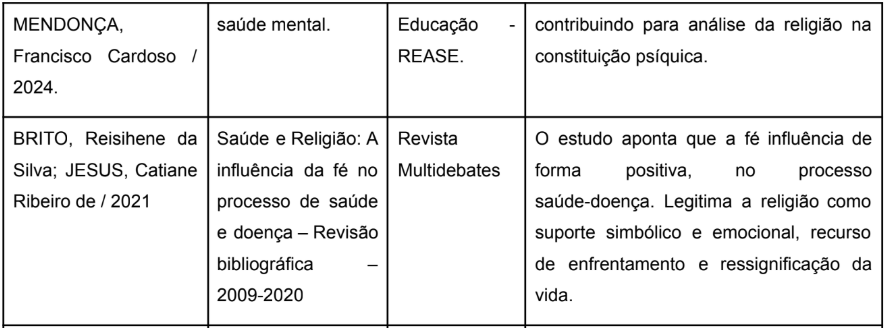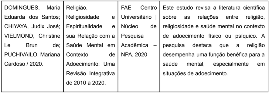 DOMINGUES, Maria Eduarda dos S. et al. Religião, religiosidade e espiritualidade e sua relação com a saúde mental em contexto de adoecimento: uma revisão integrativa de 2010 a 2020. Caderno PAIC, v.20, n.1,p.1-15, 2020. Disponível em: https://cadernopaic.fae.edu/cadernopaic/article/view/418/383. Acesso em: 24 de mai. 2025.