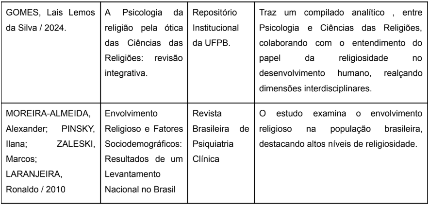 GOMES, Lais Lemos da Silva. A psicologia da religião pela ótica das ciências das religiões: revisão integrativa. João Pessoa: Universidade Federal da Paraíba, 2024. Disponível em: https://repositorio.ufpb.br/jspui/bitstream/123456789/31524/1/LLSG20082024.pdf. Acesso em 05 de abr. 2025.